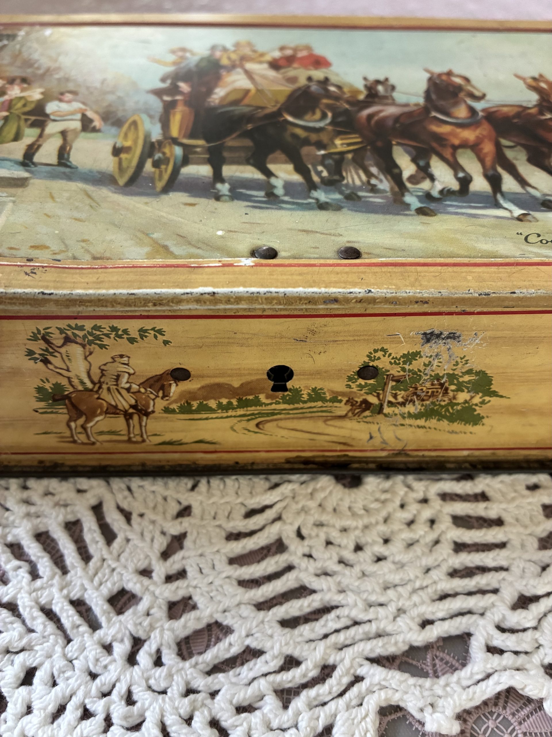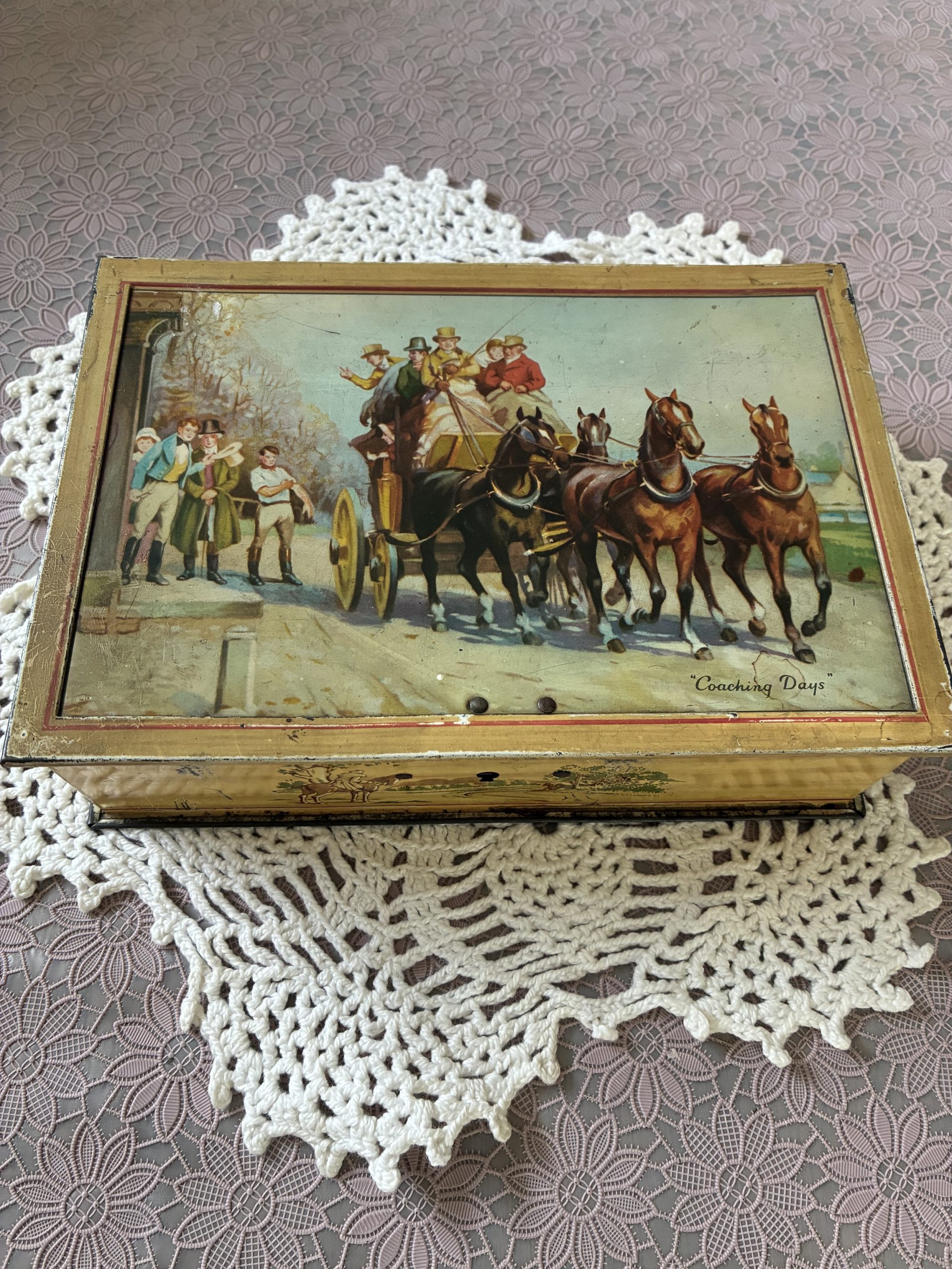 Vintage blikken doos van George W.Horner & Co.Ltd. met een illustratie van een postkoets en de titel “Coaching Days”. Helaas geen sleutel.