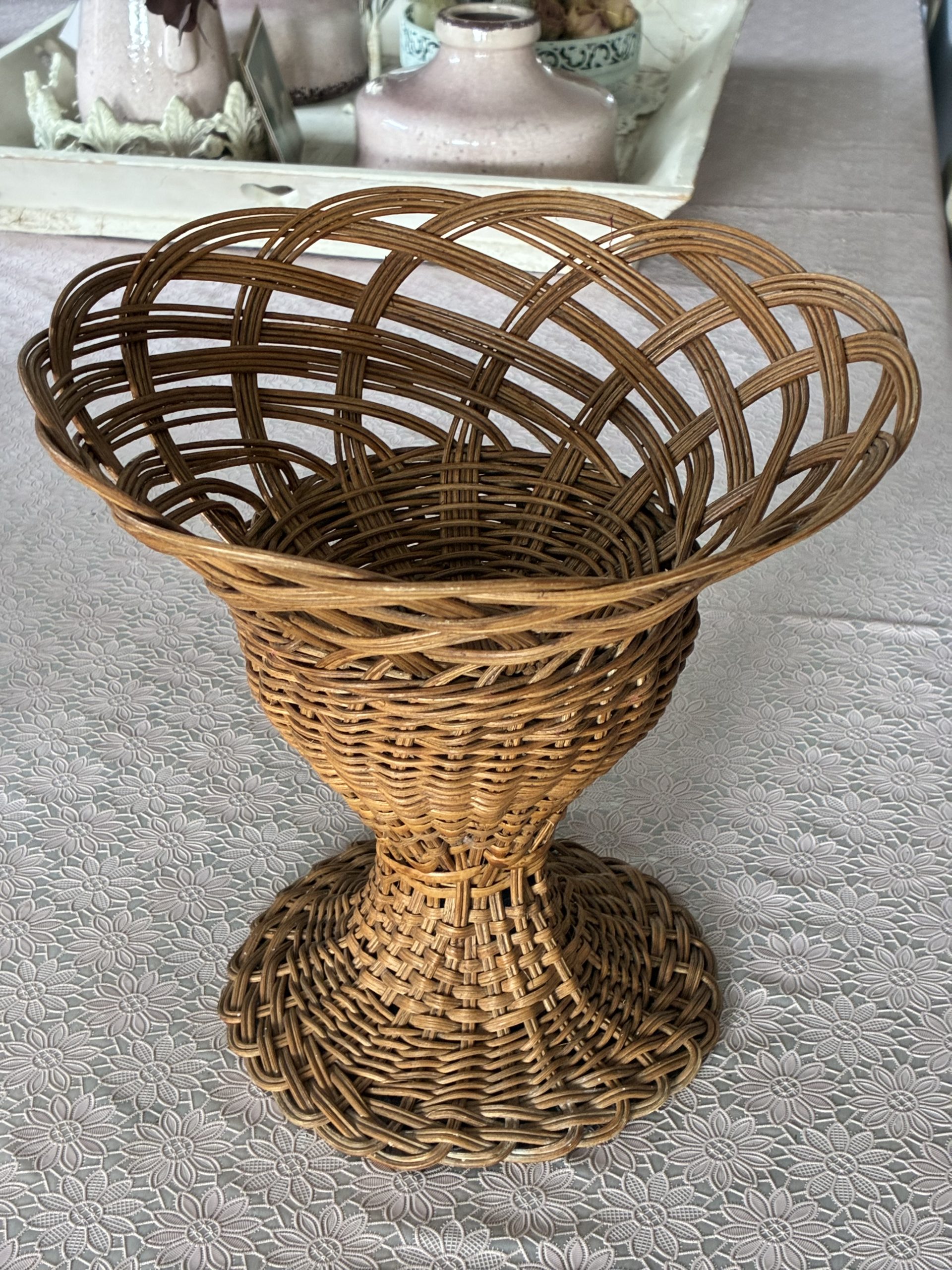 Antiek broodmandje van gevlochten riet met sokkel.Zeer apart.