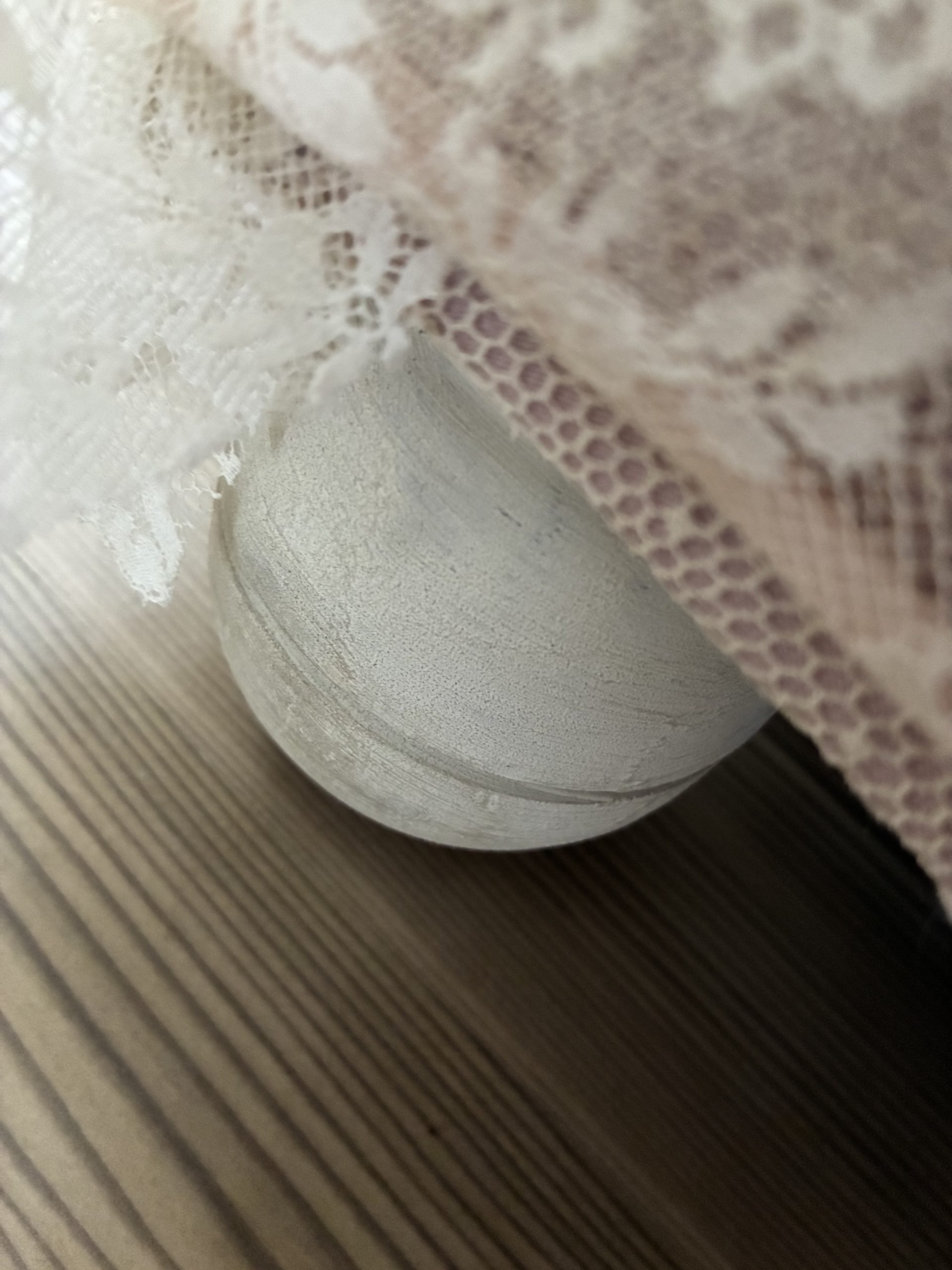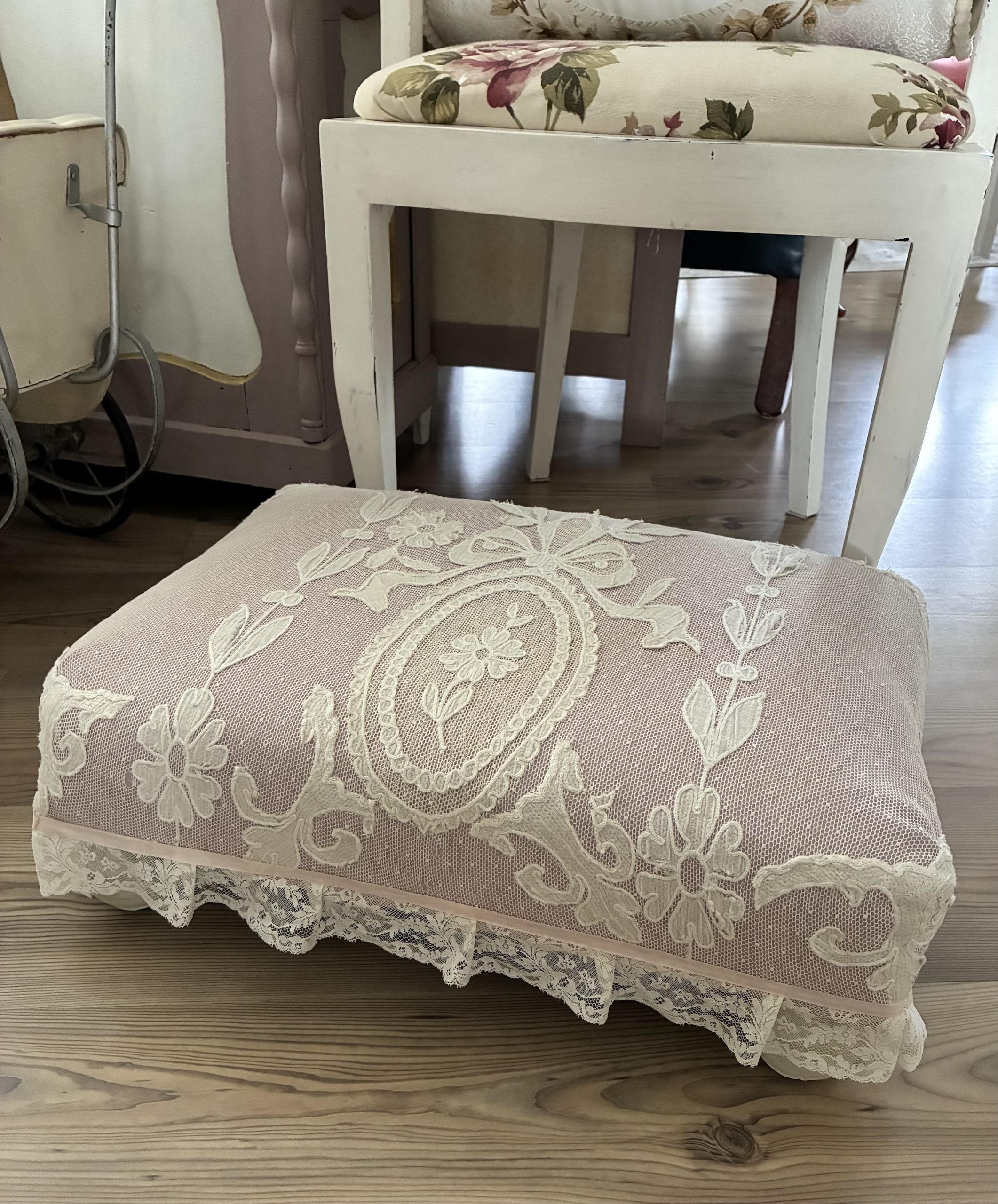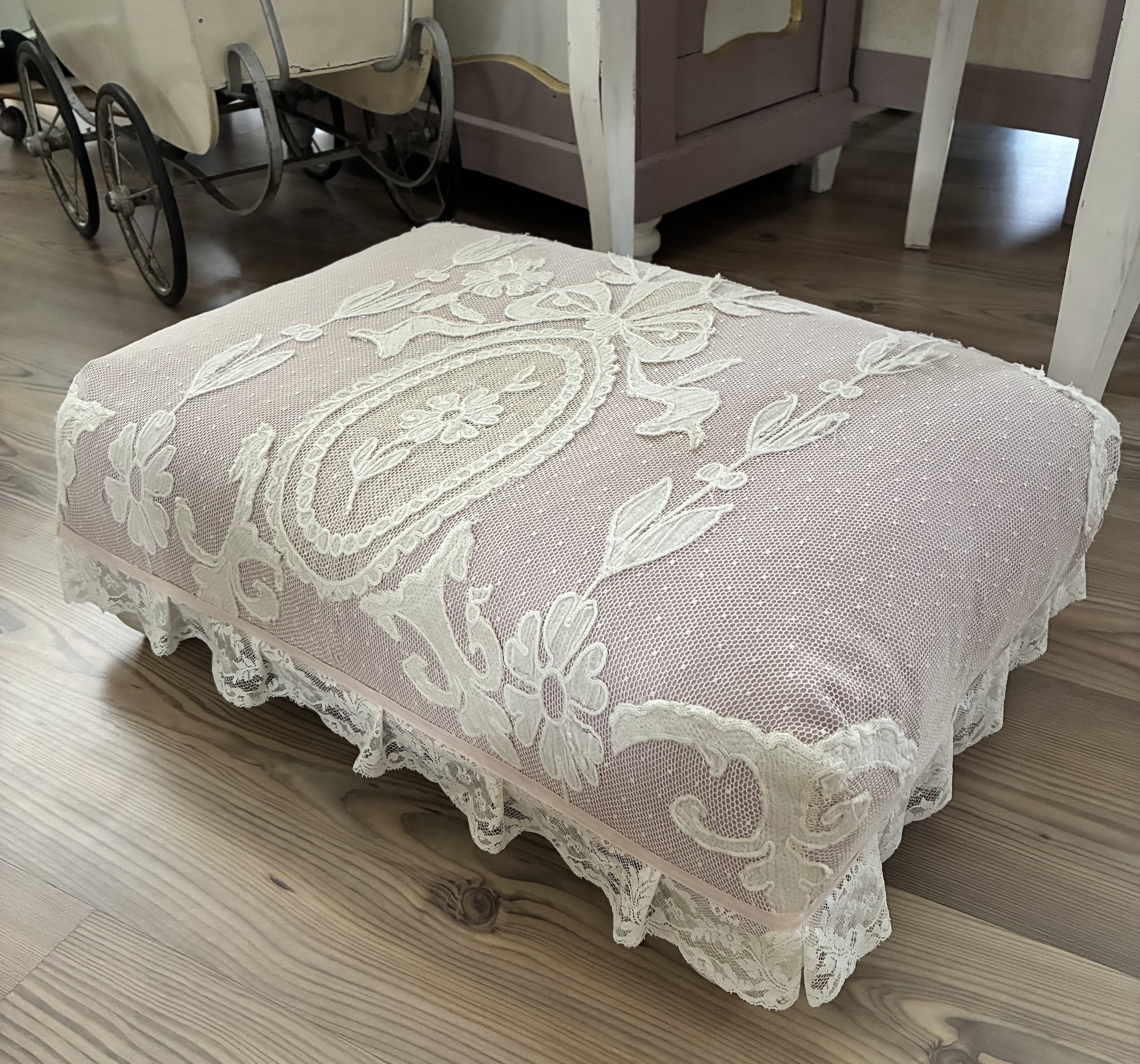 Mooie brocante foodstool, bekleed met prachtig kant. Staat op vier bolpoten en heeft een schattige ruche onderlangs.