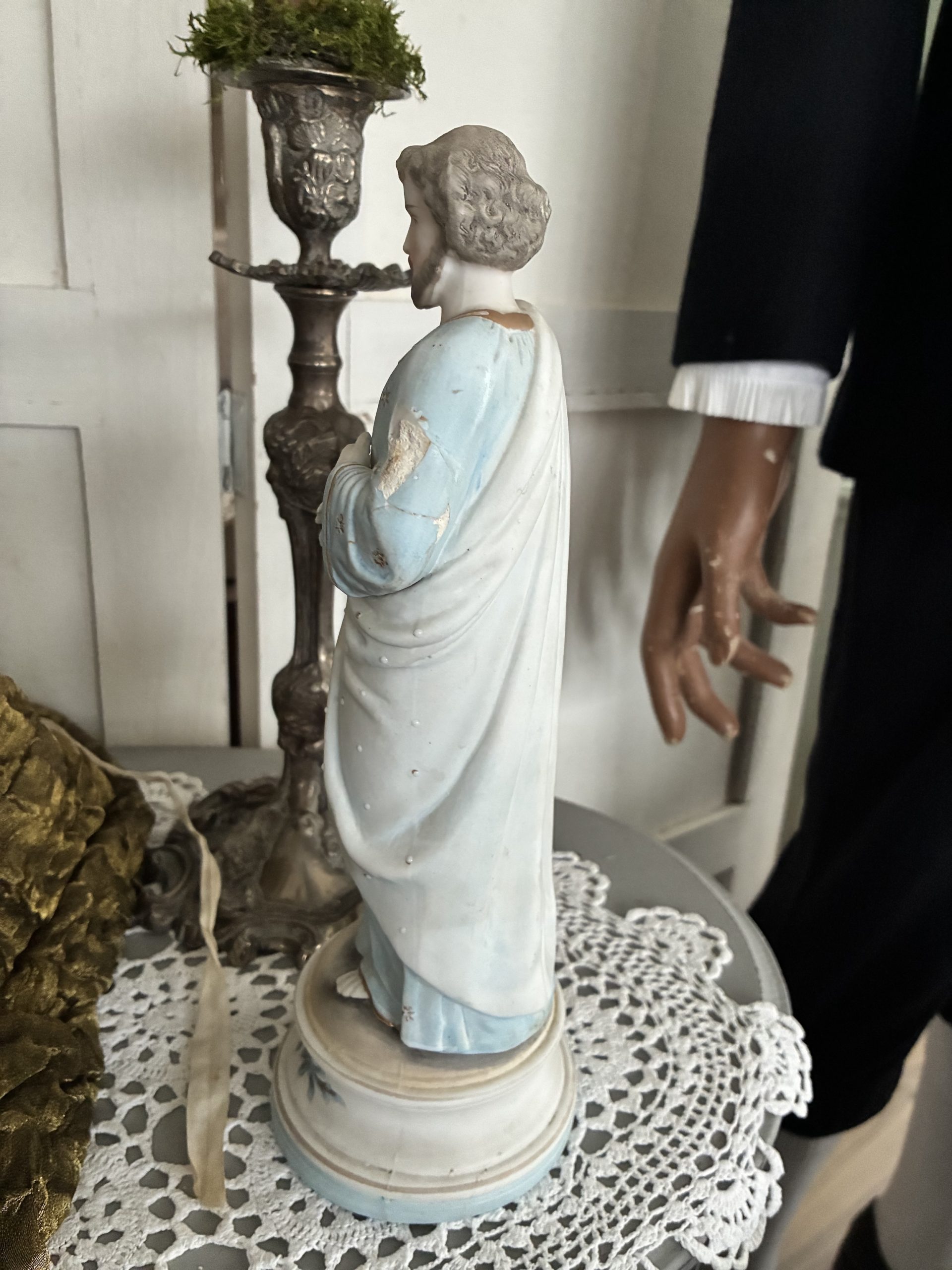 Sint-Josef de patroonheilige van o.a. timmerlieden, arbeiders en gezinnen. De pleegvader van Jezus. Een biscuit porseleinen beeldje in prachtig pastel-blauw,
